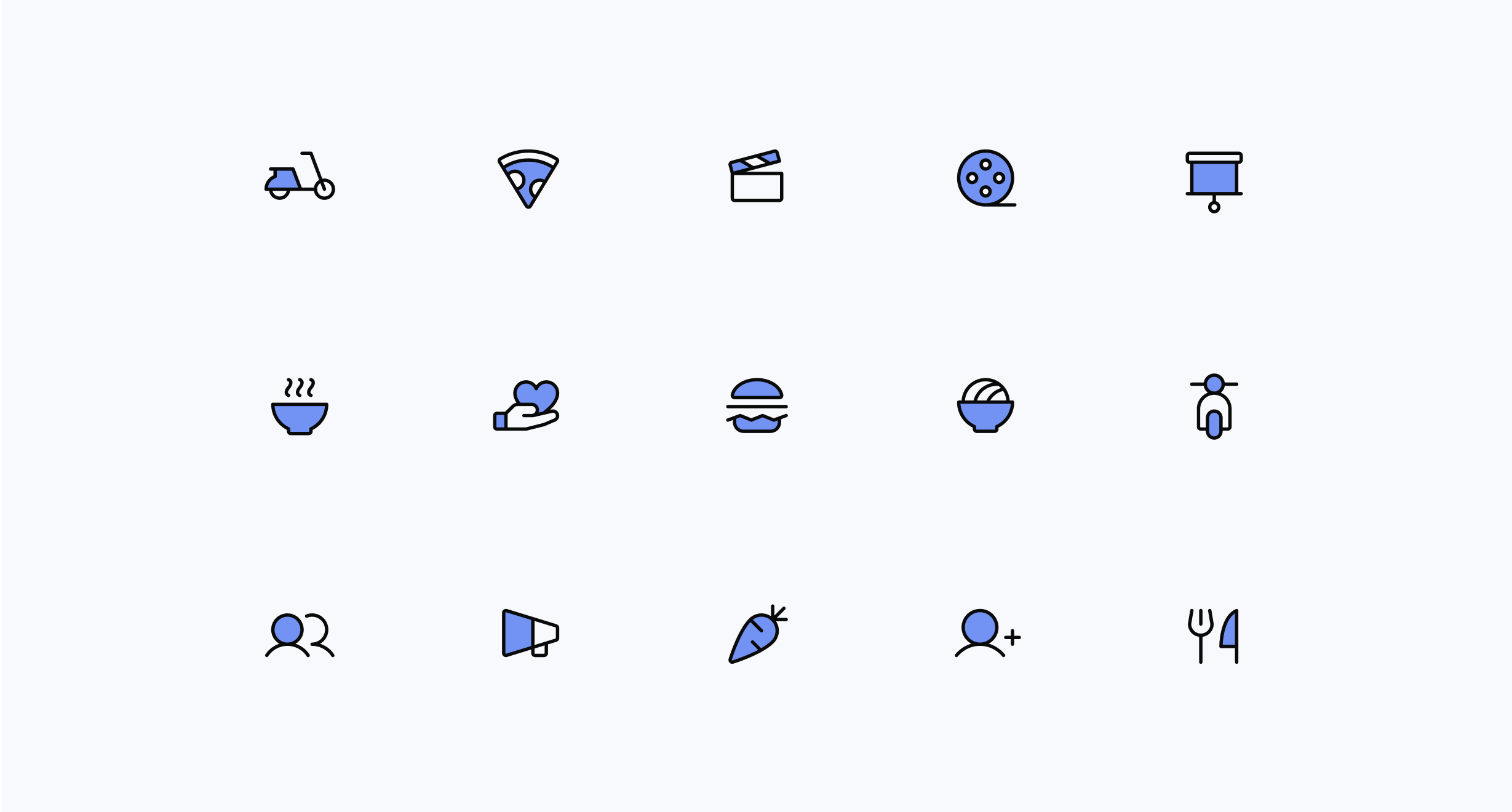 Iconography is minimal, built on a 24×24 grid with 1.5px strokes and rounded corners. Use a flat style with White as the base, Black outline and duotone blue highlights for emphasis.